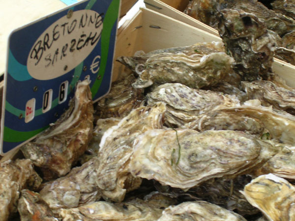 クルーズ牡蠣.これは日本のマガキを導入したもの. 生牡蠣の販売店では産地別、サイズ別に価格が表示されています。 基本的にはダース単位。サイズの大きいものは1個単位の場合もあります。 生牡蠣は、この写真のサイズ3か4が定番。通常ダース5ユーロ前後。 この写真のは1dz 6ユーロ.(2004年取材時:2013年取材のトップ写真と較べてください) 上の写真下段右の写真は逸品といわれるブルトン・サルゾー(Bretonne Sarzeau)。 ブルターニュ北西部のサルゾー(Sarzeau)の町名は 13世紀頃モルビアンという仏北西部の村の頭領(?)に因んだ名称。 ブロン種の牡蠣は一ダース18から33ユーロと他の牡蠣と比べるとかなり高価。 マガキのクルーズ生産量が年間107390トンに対し、 ブロンなどのフラットは1,650トン(殻付き:2001年調べ)。 こんな比率で、美味しいのですから高価なのは止むを得ないでしょう。 6.フランス牡蠣の病原性微生物被害とマガキの導入 現在(2003年)のフランスでは在来種に代わって、マガキの生産が90%を超えています。 全フランスの需要を満たすのに充分な生産量ですが、これには理由があります。 1966年から1969年、および1970 から 1973にかけて、 フランスの生産地では2度にわたり、牡蠣が病原性微生物に犯されて 壊滅的な打撃を受けました。 牡蠣グルメや観光客に馴染みの深い通称ブロン(Belon :Ostrea edulis) は もともと病原性微生物に抵抗力がないため、この時点ですでに2.5%くらいの生 産比率でしたが、生産量の97.5%を占める アンギュラータ(Crassostrea angulata)が寄生虫類に犯され、 5,000軒を超える事業者に9,000万米ドルの損害を与えました。 事態を重視した事業者達は最初の感染蔓延時の1966年から日本の代表的な牡蠣の 品種であるマガキを検討し始め、日本独特の寄生虫の持込を恐れる人々を 説得し、1971-77年ごろには本格的な導入を開始しました。 その後10年を経たずにマガキは病原性微生物に強く、養殖が簡易なことと、 味の良さでフランス牡蠣の主流となっています。 牡蠣の品種は亜種が出来やすく、マガキとアンギュラータは 自然交配も行われるといわれ、現在はそのような種類も フランスには混在するのではないかと推測されています(この項は2003年に書かれたもの)。 2002/2003年の生産量は推定120,000メトリックトン(MT:殻付き)。 タンカー等の汚染問題もあり、生産量は減少気味とのこと。 7.フランスの牡蠣産業関連業者による「フランスのお返し」プロジェクト