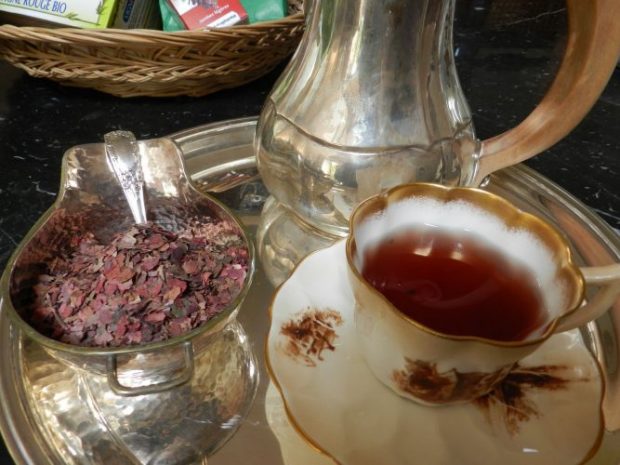 ブドウ葉や茎を紅茶と混ぜて飲みます(右の写真). ワイン用のブドウ葉は農薬が散布されますから専用の古樹(Vigne rouge)に限定して 有機栽培しています.