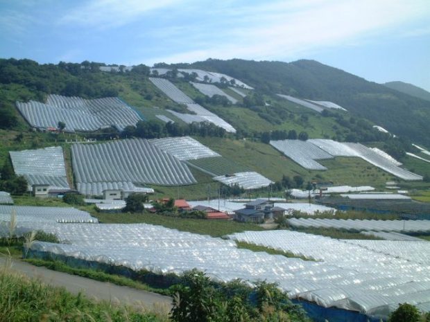 (写真上下)ビニールハウスの栽培や1-2㌶の小規模な畑が主流と ならざるを得ない日本では