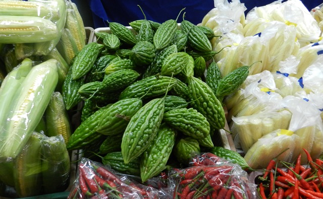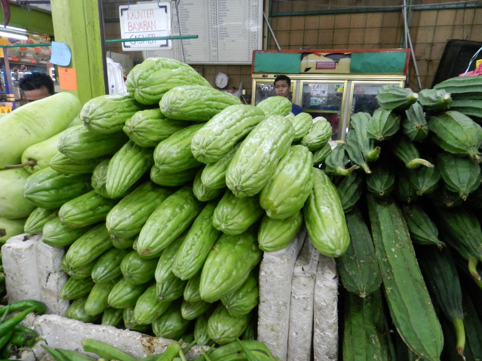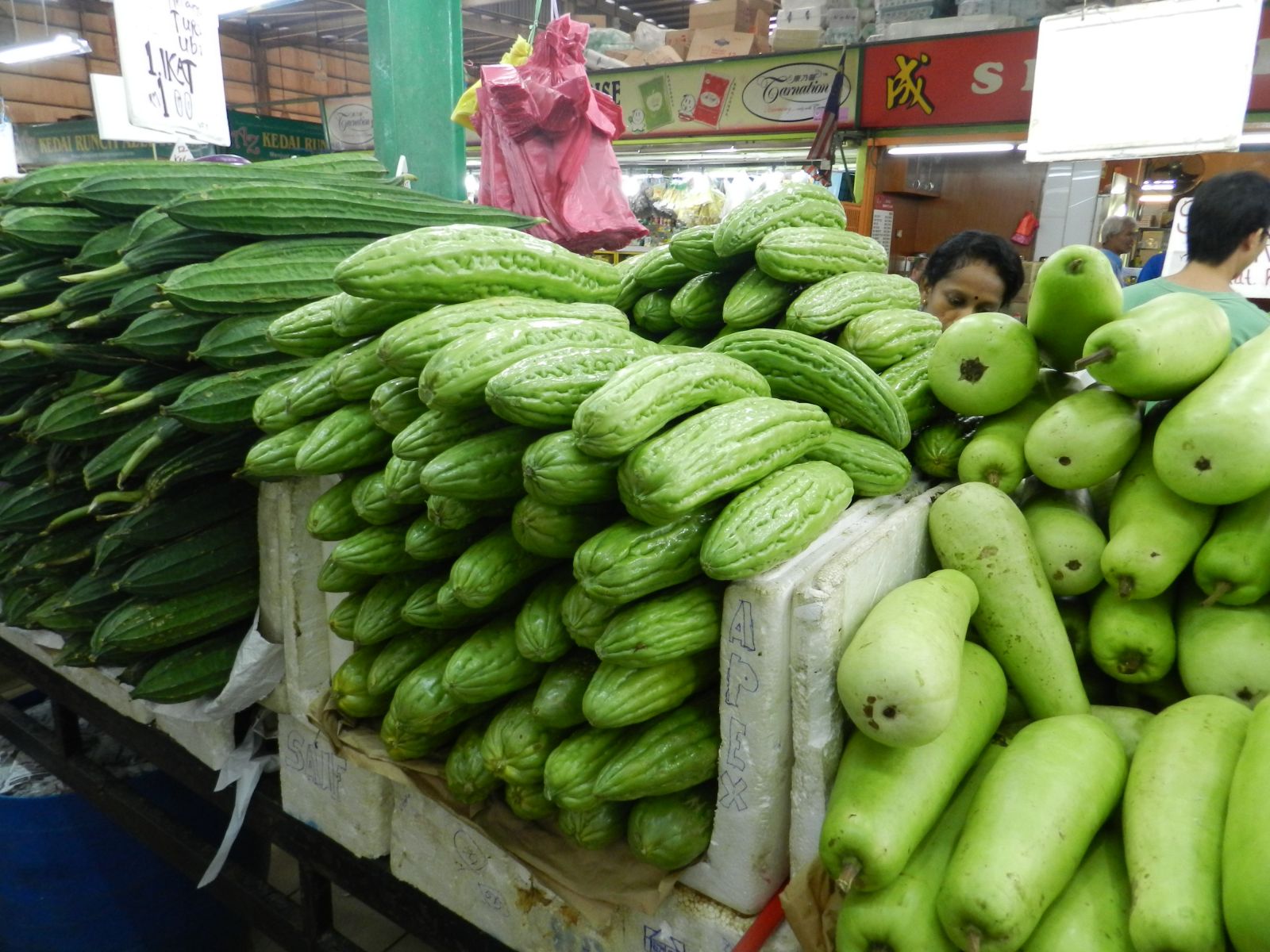 上左の写真はチカ(chi qua)と通称される小さなツルレイシ(ゴーヤー).上右はマラと呼ばれている大型。(マレーシアKLの生鮮市場)