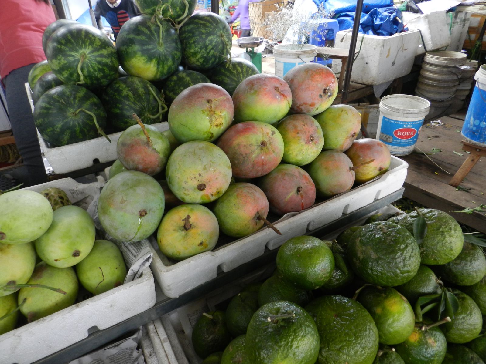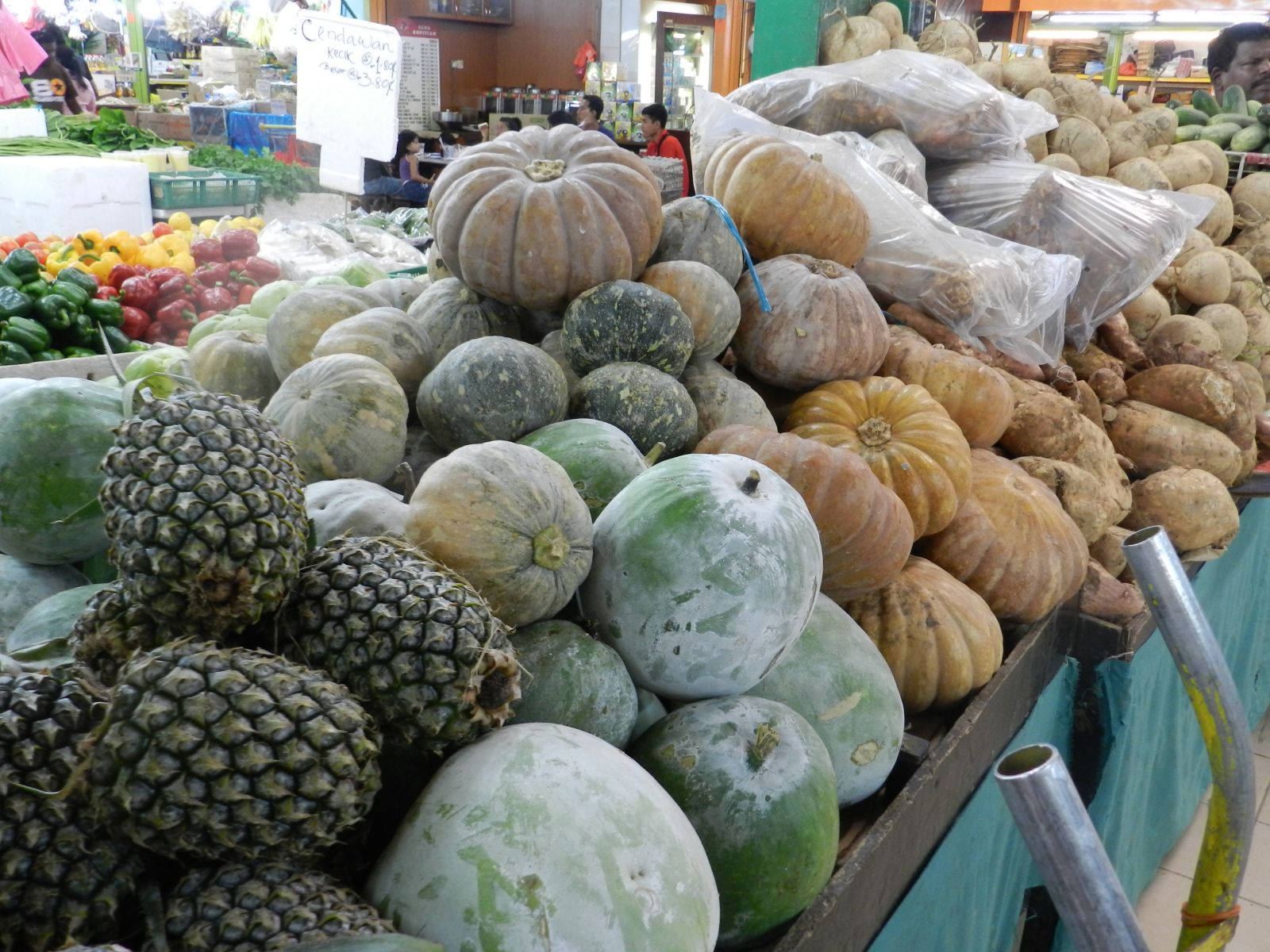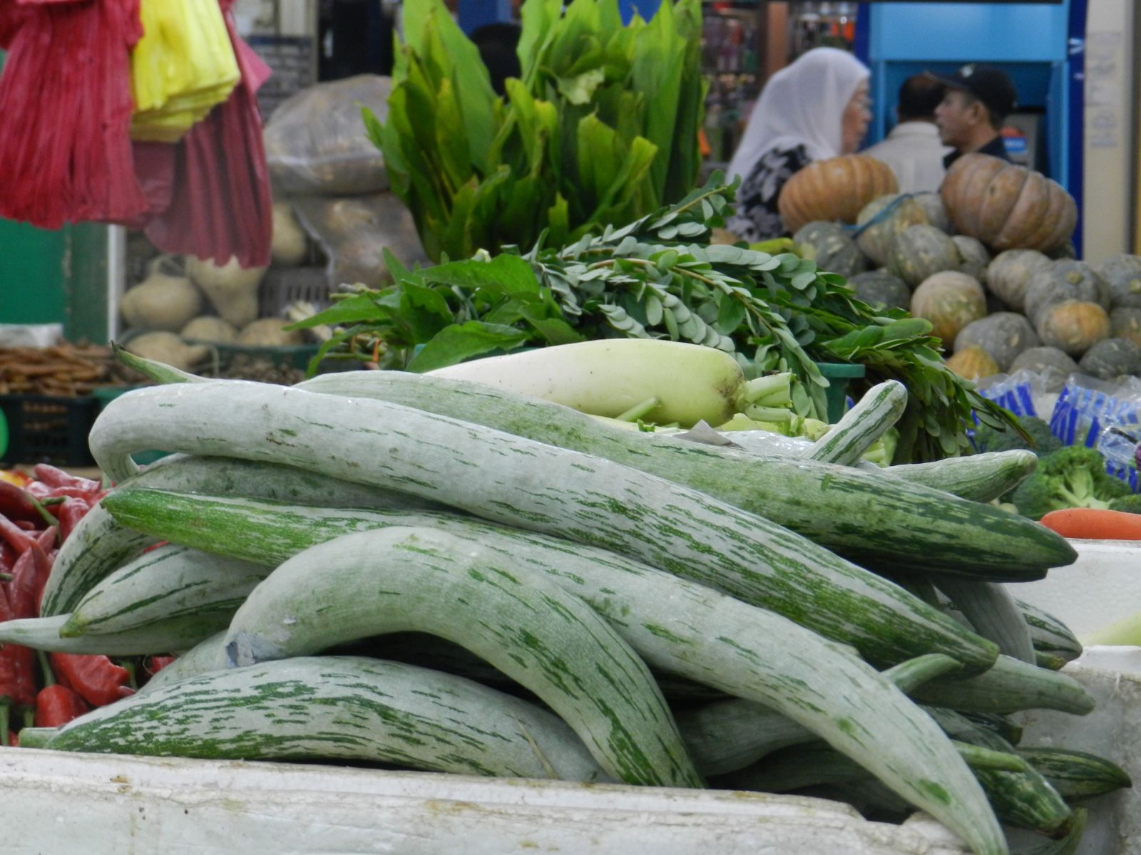 上左の写真はチカ(chi qua)と通称される小さなツルレイシ(ゴーヤー).上右はマラと呼ばれている大型。(マレーシアKLの生鮮市場)