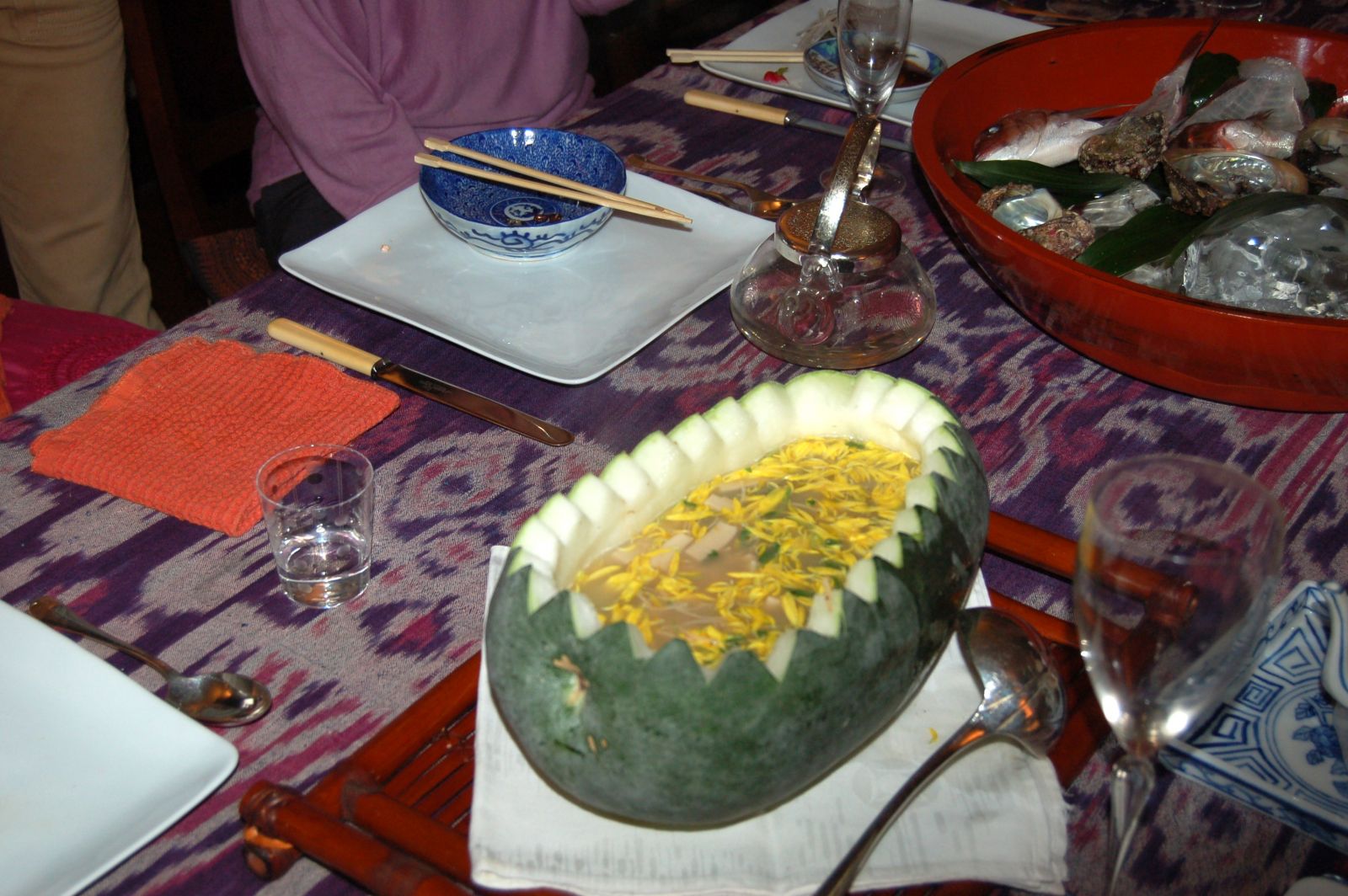 食用菊(もってのほか:山形)と冬瓜(Benincasa hispida)のスープ(鶏とホタテ出汁).