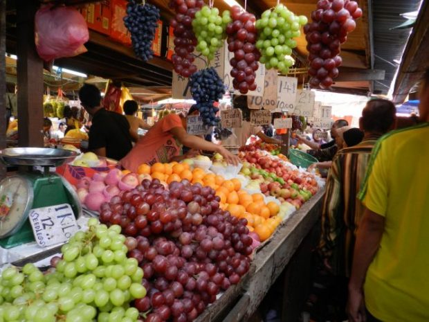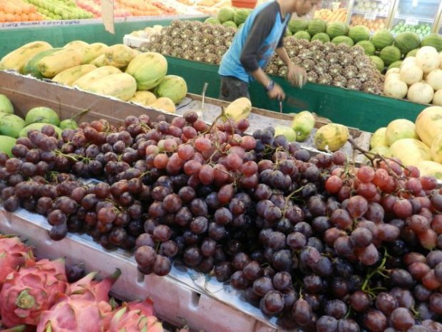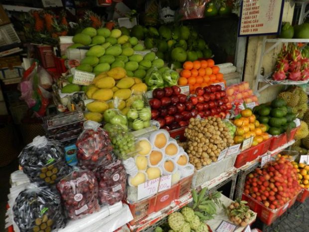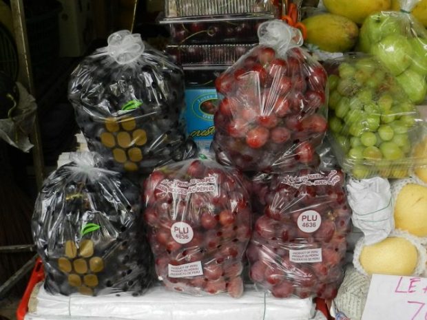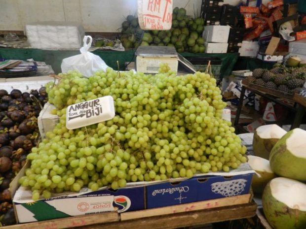 中央の赤色ブドウはペルーからの輸入.(ホーチミンの生鮮市場)