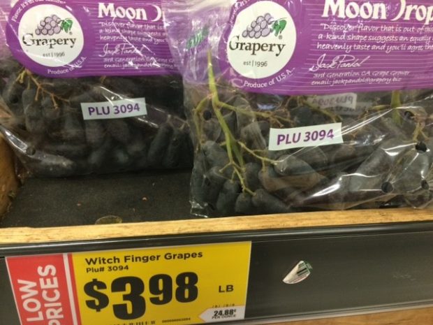 写真上右はWitch Fingers(魔女の指) と呼称する細長い黒ぶどう. 通常品より高価.
